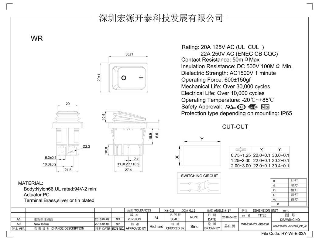额定值:20A 125VAC(UL CUL)22A 250V(ENEC CB CQC) 介电电压强度:1500VAC持续1分钟 接触电阻:50mΩ 最大绝缘电阻:100MQ 最小工作寿命:10000Cyles 最小工作温度:0°C~+85°C 保护等级:lP65